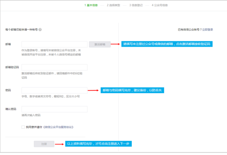微信公眾號(hào)注冊(cè)規(guī)則多變,此處為現(xiàn)在注冊(cè)大體流程。僅供參考,實(shí)際以注冊(cè)時(shí)操作為準(zhǔn)?。?/span>