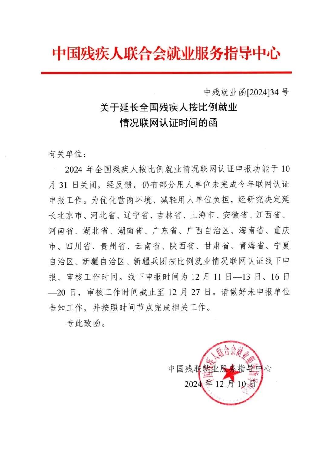有關(guān)單位:2024年全國殘疾人按比例就業(yè)情況聯(lián)網(wǎng)認(rèn)證申報(bào)功能于10月31日關(guān)閉,經(jīng)反饋,仍有部分用人單位未完成今年聯(lián)網(wǎng)認(rèn)證申報(bào)工作。為優(yōu)化營商環(huán)境、減輕用人單位負(fù)擔(dān),經(jīng)研究決定延長北京市、河北省、遼寧省、吉林省、上海市、安徽省、江西省、河南省、湖北省、湖南省、廣東省、廣西自治區(qū)、海南省、重慶市、四川省、貴州省、云南省、陜西省、甘肅省、青海省、寧夏自治區(qū)、新疆自治區(qū)、新疆兵團(tuán)按比例就業(yè)情況聯(lián)網(wǎng)認(rèn)證線下申報(bào)、審核工作時(shí)間。線下申報(bào)時(shí)間為12月11日-13 日、16日-20日,審核工作時(shí)間截止至12月27日。請(qǐng)做好未申報(bào)單位告知工作,并按照時(shí)間節(jié)點(diǎn)完成相關(guān)工作。